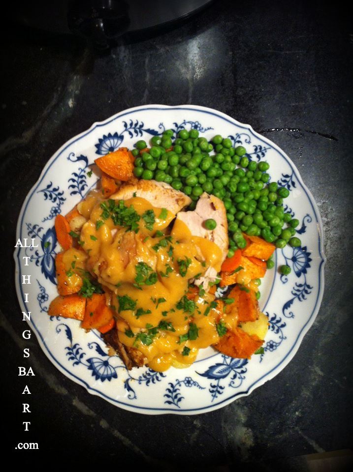 I CAN NOT begin to tell you how amazing this Crock-Pot Turkey Recipe is! Forget your mom’s turkey…… Mind blown. This is to die for Turkey in a crock pot, with gravy that is well worth killing for. The roasted sweet potatoes, carrot concoction just ties it all together and will have you wanting seconds. Oh and peas, because I feel guilty if there is nothing green on the plate.